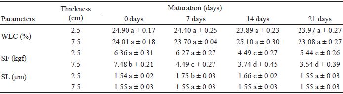 The results of the data analysis of the studied variables are summarized in Tables 1 and 2 as a function of cut thickness and maturation time. Neither factor influenced pH or WLC (both P > 0.05). The results revealed the correct handling and external interference control of commercial cuts (larger or steak cuts) with a behavior similar to that of matured, vacuum-packed sirloin commercially available in Brazil.