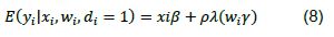 Donde / implica que el joven ha iniciado su vida sexual y /representa que el joven usa métodos anticonceptivos2. Tanto / como / tienen una distribución normal con media cero y una correlación igual a rho (/ ). La ecuación (7) solo puede ser calculada para aquellas observaciones con /. Bajo la presencia de un sesgo de selección muestral, la estimación de (7) produciría estimadores sesgados. De esa forma, para Wooldridge (2010) la estimación correcta de (7), la cual corrige el sesgo de selección, es la siguiente: