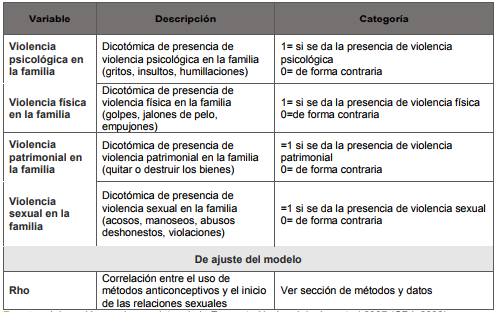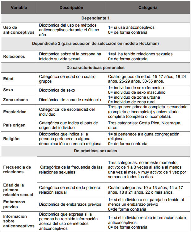 Dentro de la información sexual recabada y de interés para este estudio, se encuentra el inicio de las relaciones sexuales. A las personas que indicaron haber iniciado su vida sexual se les consultó si durante el último año habían usado algún método anticonceptivo y qué tipo de método habían escogido. A partir de lo anterior se generó la variable binaria de uso de métodos anticonceptivos (Yi, igual a 1 en el caso de uso de métodos e igual a 0 en el caso contrario), que se utiliza como variable dependiente en el modelo econométrico desarrollado.