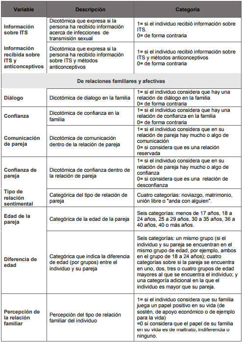 De relaciones: presencia de diálogo y confianza en la familia; confianza y comunicación en la relación de pareja; tipo de relación (noviazgo, matrimonio, unión libre o "anda con alguien"); edad de la pareja; diferencia entre la edad del individuo y la edad de su pareja; percepción del individuo sobre la relación con su familia; y presencia de diferentes tipos de violencia dentro del hogar.