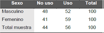 El Cuadro 1 presenta el uso de métodos anticonceptivos desagregado por sexo. Se observa un mayor uso por parte de las mujeres (59%) en comparación con los hombres (52%).