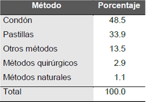 El Cuadro 2 presenta el uso de anticonceptivos por método. Como se puede observar, el condón y las pastillas anticonceptivas fueron los más comunes entre los jóvenes encuestados, con un porcentaje de elección de 48.5% y 33.9%, respectivamente. Los métodos naturales son los menos utilizados, llegando solamente a un 1%.
