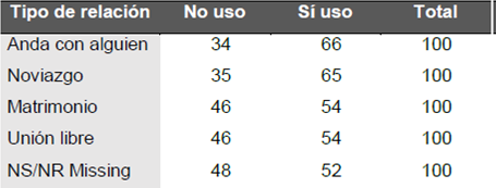 El Cuadro 3 presenta información acerca del uso de métodos según el tipo de relación. Las personas en unión libre y matrimonio (aquellas relaciones percibidas con un mayor nivel de compromiso) tienen porcentajes de uso de anticonceptivos menores a aquellas que se encuentran en relaciones con un menor rango de formalidad (noviazgo y "andar con alguien").
