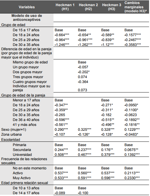 Estar en un rango de edad de 30 a 35 años reduce la probabilidad de usar métodos anticonceptivos con respecto a aquellos que están en un rango de 15 a 18 años. Este resultado podría deberse al hecho de que es más probable estar en una relación con un nivel de compromiso mayor (matrimonio o unión libre) cuando se sobrepasan los 30 años, lo cual llevaría a una menor tasa de uso de métodos. Por ello, en las especificaciones H2-H3 se ha controlado por tipo de relación con el resultado de que el rango de edad de 30 a 35 años conserva su efecto negativo. Los demás grupos de edad también disminuyen la probabilidad de uso con respecto al grupo base (15 a 18 años).