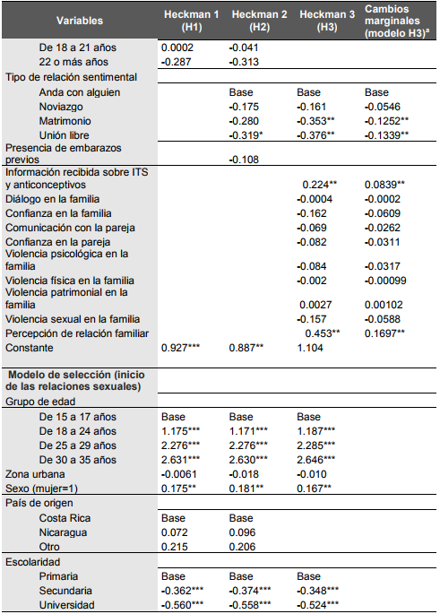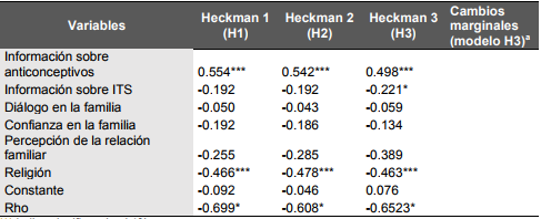 El Cuadro 4 (página 21) muestra los resultados de los modelos calculados. La primera especificación (H1) incluye variables socioeconómicas, de relaciones afectivas y de prácticas sexuales. La segunda (H2) controla según los tipos de relaciones sentimentales y la presencia de embarazos previos. La última (H3) incluye variables de entorno familiar, relación con la pareja e información recibida sobre ITS y anticonceptivos.