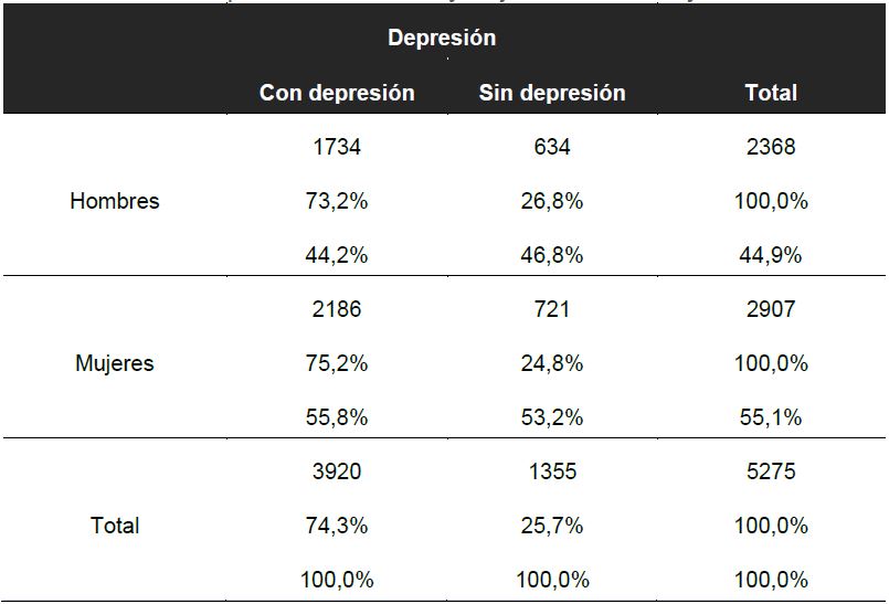 Se encontró que 3920 personas entrevistadas presentaban depresión; es decir, el 74.3% de la población consultada se ha sentido deprimida, infeliz, sola, cansada, sin energía, triste, agobiada, que no disfrutaba de la vida, con sueño intranquilo, síntomas presentes durante dos o más semanas seguidas (1734 hombres y 2180 mujeres) (ver Tabla 1). Estas cifras sobrepasan las estimaciones propuestas por la ENSANUT 20123 y por la OMS, 20114. Es relevante advertir que el 55.8% de las mujeres y el 44.2% de los hombres reveló estos síntomas, por lo que la situación concuerda con la evidencia empírica que señala mayor prevalencia de depresión en mujeres mayores.