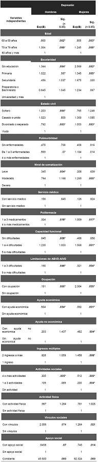 Las pruebas de ajuste del modelo resultaron estadísticamente significativas para explicar la depresión mayor (p< 0.05), por lo que se estimó que las variables explicaron el modelo en un 72.9% en hombres, mientras que en el caso de las mujeres este porcentaje aumentó a un 84.9%. Además, es importante mencionar que la categoría de comparación o contraste es la última en cada variable.