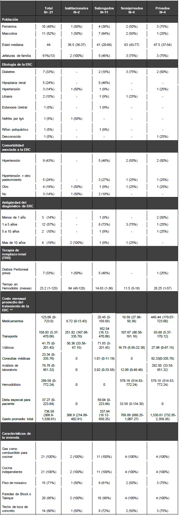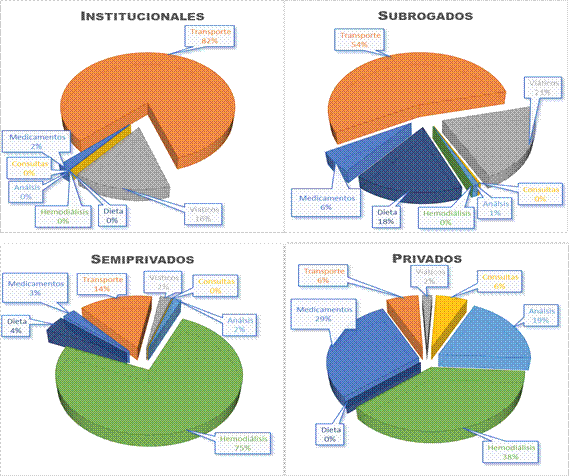 Para evaluar los gastos que erogan mensualmente pacientes en la atención de su padecimiento se crearon 4 grupos. En el primer grupo se incluyeron pacientes institucionales del IMSS y el ISSSTE que reciben hemodiálisis intramuros en una clínica de esas instituciones. El siguiente grupo se integró con pacientes a quienes subroga el IMSS y reciben hemodiálisis extramuros en la unidad privada contratada por la institución. En el tercer grupo hay pacientes con afiliación al IMSS que no aceptaron la terapia de diálisis peritoneal que les ofrece la institución y que prefieren pagar el servicio de la unidad privada de hemodiálisis, reciben los medicamentos de su institución y solo en un caso los estudios de laboratorio; a este grupo lo denominamos semiprivado. Finalmente, está el grupo de pacientes privados, que cubren con sus recursos la totalidad del tratamiento; de los cuatro pacientes en esta última clasificación hay dos afiliados al SP; sin embargo, al no recibir tratamiento por parte de esa institución, tienen que cubrir con sus recursos los gastos que requiere el tratamiento de la ERC.