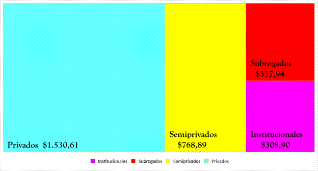 En resumen, para presentar los gastos en promedio por paciente al mes para cada grupo, podemos empezar por pacientes institucionales del IMSS y del ISSSTE, cuyo promedio es de $308.9 por persona atendida. Para el grupo de pacientes subrogados el gasto es de $337.94 USD; en este grupo, el paciente que gasta más invierte $650.25 USD, mientras el que menos gasta únicamente destina $16.12 USD para su tratamiento. El grupo de pacientes semiprivados reporta un promedio mensual de $768.89 USD; dentro de este, el paciente que realiza el gasto más elevado destinó $1,007.27 USD, mientras que la persona que menos gasta necesita $680.25 mensuales. Finalmente el GPM total más alto es reportado por pacientes privados, que invierten $1,530.61 USD por persona atendida; en este grupo el monto más elevado para el pago mensual del tratamiento es de $2,359.26 USD, en tanto que el paciente que gastó menos necesitó $732.85 USD (ver Figura 2 y Tabla 2).