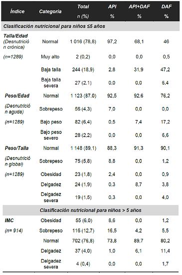 Al analizar todos los índices antropométricos en conjunto se observó que las niñas y los niños benefician del programa DAF (41,9%) mostraron una prevalencia más alta de deficiencias nutricionales en comparación con el grupo de API (2,2%) y de API+DAF (23,1%; p <0,05; datos no mostrados). Esta misma relación se observó al comparar los distintos índices antropométricos individualmente (Tabla 2).