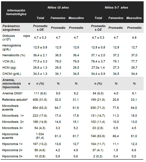 Se recolectaron muestras de sangre venosa de la población infantil (n expandido=2203, 88%) en tubos de 5 ml con anticoagulante ácido etilendiaminotetraacético (EDTA). Los hemogramas se realizaron utilizando el equipo automatizado Sysmex TX 1800i. A aquellas muestras que presentaron alteraciones en los valores hemáticos, se les realizó un frotis sanguíneo teñido con colorante de Wright. Según los valores de referencia de la Organización Mundial de la Salud (OMS), se definió como anemia un nivel de hemoglobina <11,0 g/dL y/o hematocrito <33% en personas de 6 meses hasta 5 años y de hemoglobina <11,5 g/dL y/o hematocrito <34% en personas >5 años (OMS, 2001). En el estudio actual, y según recomendación del Departamento de Análisis Clínicos de la Facultad de Microbiología de la Universidad de Costa Rica (UCR), se refirió a las niñas y los niños con un nivel de hemoglobina <12,0 g/dL y/o con hematocrito <34% para su atención médica y/o seguimiento; con ayuda de la Dirección Nacional de CEN-CINAI se verificó la atención médica de la niñez referida.