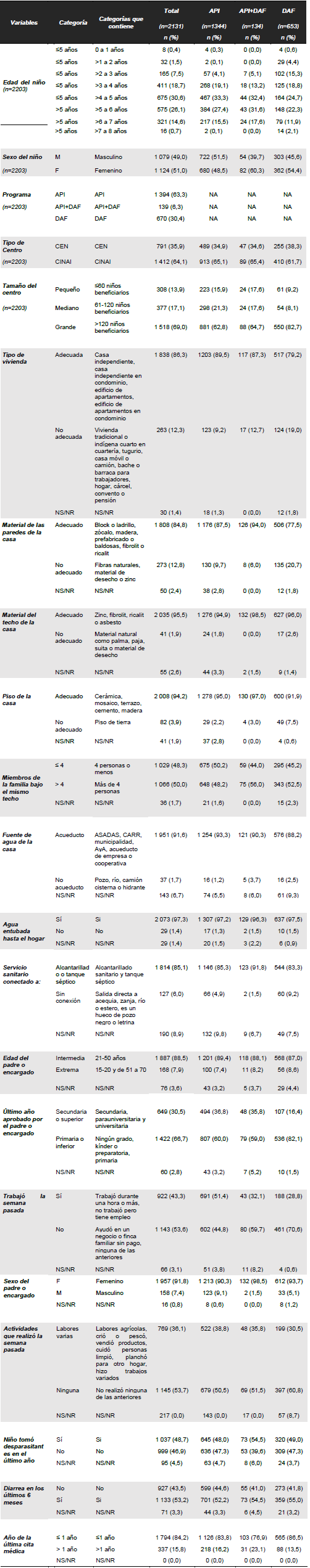 Un total de 2435 madres, padres de familia o personas encargadas completaron la EENH; sin embargo, solamente a 2131 de sus niñas y niños se les tomaron simultáneamente medidas antropométricas y se les recolectaron muestras de sangre. La mayoría de menores que se incluyen en el estudio tenían entre 4-5 años (30,6%) y cerca de la mitad eran niñas (51,0%; Tabla 1). En comparación con quienes se benefician de DAF, la niñez beneficiaria de API reporta un mejor tipo de vivienda (89,5%), mejores materiales de paredes de la casa (87,5%), tipo de piso (95,0%) y servicio sanitario (85,3%; p <0,05). Las personas encargadas de las niñas y los niños beneficiarios de API también contaban con nivel educativo más alto (36,8% habían completado al menos un año de secundaria), sus familias eran más pequeñas (50,2% tenían una familia con ≤4 miembros) y tenían una fuente de abastecimiento de agua más segura (93,3% recibía agua de acueducto) que las personas encargadas de quienes se beneficiaban de DAF (p <0,05) (Tabla 1).