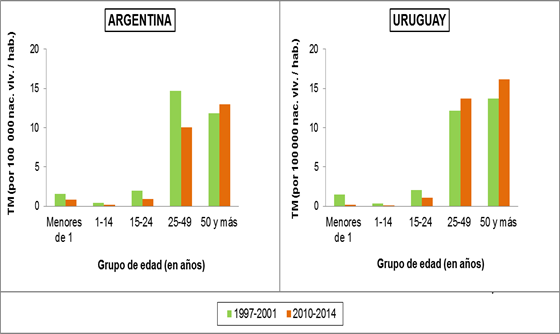 Si se considera el grupo de edad, la TM aumenta ligeramente en las argentinas de 50-64 años y disminuye en las restantes mujeres analizadas. También, aumenta la TM masculina para este tramo etario en ambos países, incluso supera a la población de 65 y más años, sobre todo en Uruguay, y deja de exhibir los valores inicialmente más bajos (Tabla 1).