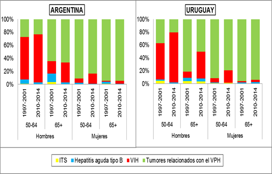 Esta estructura difiere en cierta medida, incluso entre países, en los hombres de 65 años y más. Por un lado, en los dos países son más frecuentes las muertes asociadas al VPH, seguidas por las atribuidas al VIH, la hepatitis aguda tipo B y las ITS (Figura 2). Por otro lado, la TM vinculada a estas dos últimas causas disminuye en Argentina, mientras que el resto de las tasas aumentan en los dos países (Tabla 1).