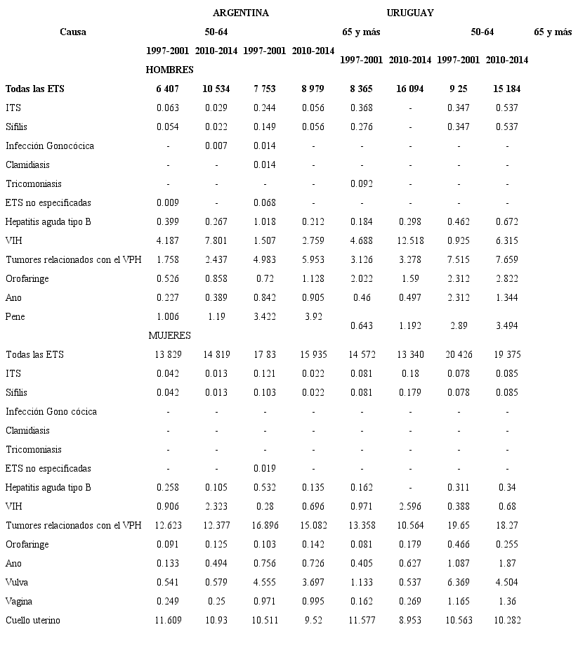 Finalmente, entre las ITS, se destaca la sífilis con tasas de mortalidad decrecientes en Argentina y casi siempre crecientes en Uruguay (Tabla 1).