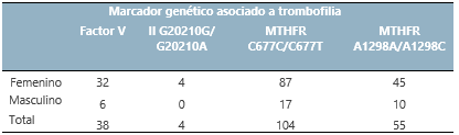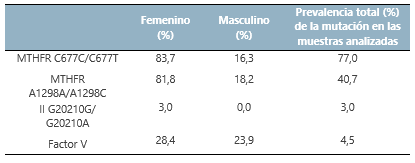 Además de las muestras referidas, se obtuvo la información mencionada en la tabla 1, en torno a las muestras positivas. Se observa que la mutación más prevalente es la MTHFR, luego, la del factor V Leyden; ambas aparecen en mayor número en las mujeres.