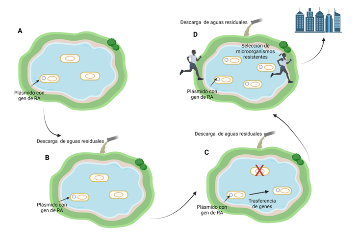 Nota. A. En un ecosistema acuático (cuerpo receptor de efluentes de plantas de tratamiento de aguas residuales) coexisten bacterias resistentes y sensibles a los antibióticos. B. La contaminación con residuos de antimicrobianos genera presión selectiva sobre las bacterias residentes en el ecosistema. C. La presión selectiva generada por la descarga continua de contaminantes favorece la transferencia de elementos genéticos móviles que posean genes de RA. D. La comunidad de microorganismos cambia su composición de genes, favoreciéndose la preponderancia de bacterias resistentes, las cuales pueden entrar en contacto con seres humanos y diseminar la resistencia en otros ambientes. Imagen creada con BioRender.
