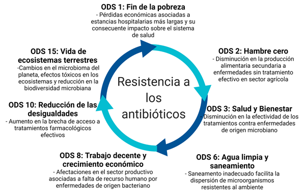 Abstract: Introduction. Antibiotic resistance (AR) is an increasingly complex public health problem, considered one of the greatest threats globally. The development of AR in bacterial pathogens is an expected consequence of evolutionary adaptation due to antimicrobials contamination in the environment. However, multiple factors are associated with the emergence and dissemination of AR, including excessive and poorly regulated use of antibiotics in human and animal medicine, agriculture, livestock, and industry, among other fields. The role of the environment as a reservoir for the generation and dissemination of AR genes and AR bacteria has recently been indicated. The approach to contain and control this problem involves multiple disciplines such as human and animal medicine, the environment, the industry, and the economy. This article describes the AR problem, the factors associated with its origin, and the multidisciplinary approach proposed for its management at a global level. Also, it will be described how AR affects sustainable development according to the UN 2030 Agenda, in compliance with some of the sustainable development goals.