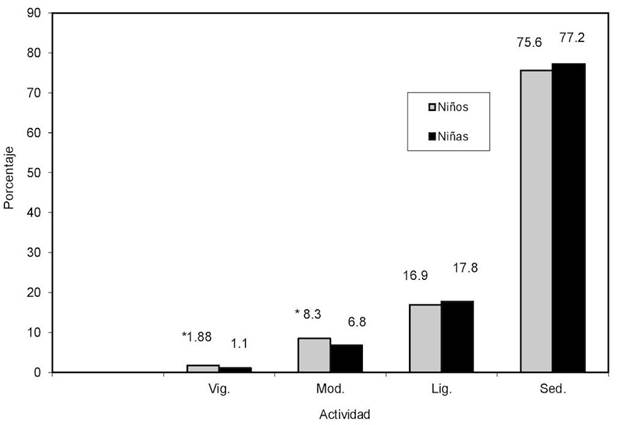 Sin embargo, al analizar el %TAF de vigorosa intensidad de los escolares estudiados, los niños apenas obtuvieron un 1.8 % equivalente a 25.5 min/día y las niñas, un 1.1% equivalente a 15.2 min/día, lo cual es realmente muy bajo, pues no superan ni siquiera 30 min/día para AF de vigorosa intensidad. Esto refleja que ambos grupos invierten muy poco tiempo al día para realizar AF que demanden un mayor esfuerzo corporal.