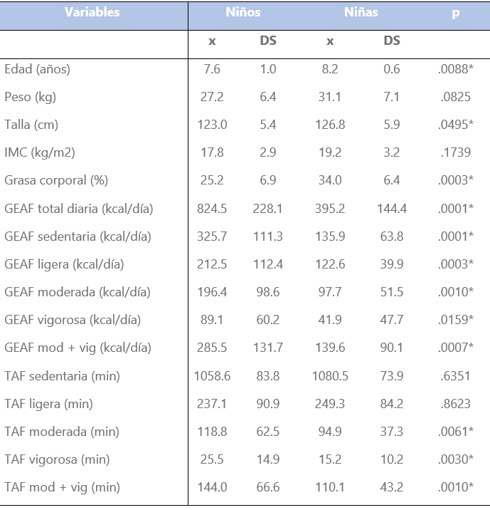 Con respecto al GEAF total diario (kcal/día), este fue significativamente superior (p<0.05) en los niños. La diferencia del GEAF total diario entre los niños y las niñas fue de 429.3 kcal/día. También se encontró que los niños obtuvieron resultados significativamente mayores (p<0.05) para el GEAF (kcal/día) en la condición sedentaria, ligera, moderada y de vigorosa intensidad.