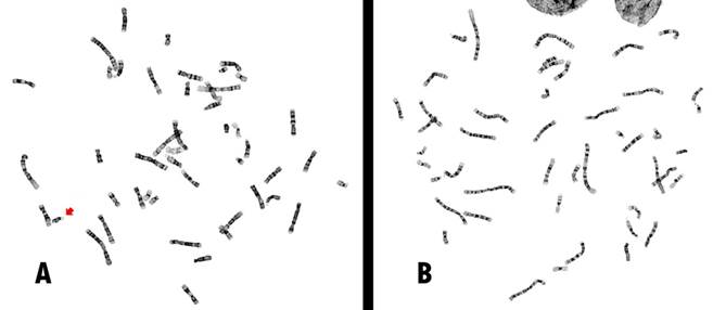 Nota. A. Línea celular con alteración cromosómica. Se observan 47 cromosomas con la presencia de un cromosoma marcador supernumerario (flecha en color rojo). B. Línea celular normal. Se observan 46 cromosomas normales.