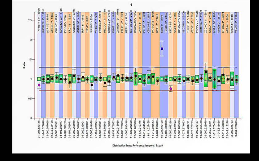 Para la MLPA, los datos se estudiaron con el programa Coffalyser (MRC-Holland) y, en adición, fueron corroborados en una hoja de cálculo con el programa Excel (Microsoft Office), con el propósito, en ambos casos, de obtener un cociente de dosificación (CD), donde CD = [(intensidad de fluorescencia de la sonda analizada/intensidad de fluorescencia de cada una de las otras sondas)] / [(intensidad de fluorescencia de la sonda del control/intensidad de fluorescencia de cada una de las otras sondas del control)]. El CD permite comparar con los controles, de manera que, si una persona presenta dos copias de la sonda analizada, se espera una razón 1:1 (CD cercano a 1), en las microdeleciones, se espera un CD cercano a 0,5 y en las microduplicaciones, uno aproximado a 1,5.