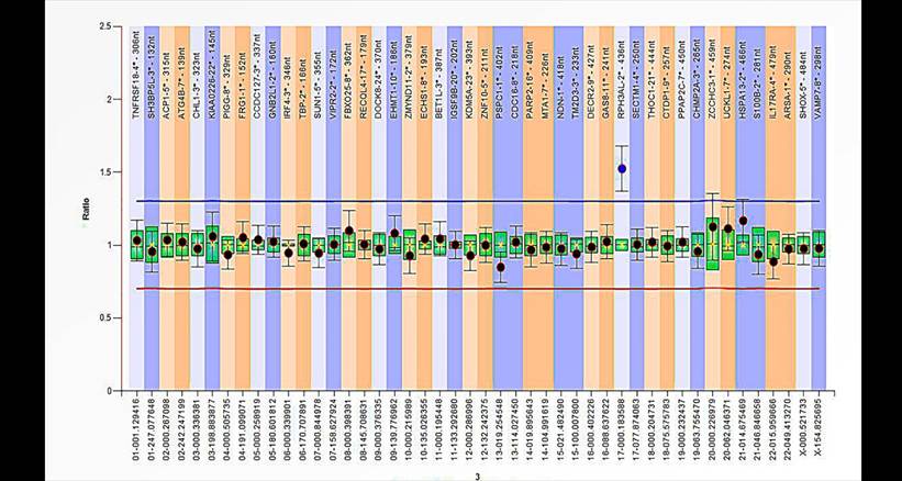 Nota. Resultado con el kit SALSA P070 donde se observa un valor anormal del cociente de dosificación para la zona 17p. La sonda con resultado alterado corresponde al gen RPH3AL.