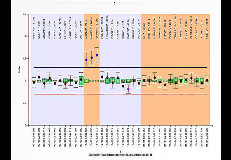 Nota. Este kit contiene tres sondas para esta región, que corresponden a los genes MKRN3, MAGEL2, SNRPN, respectivamente. Al evidenciar cocientes de dosificación elevados, se confirma el resultado.