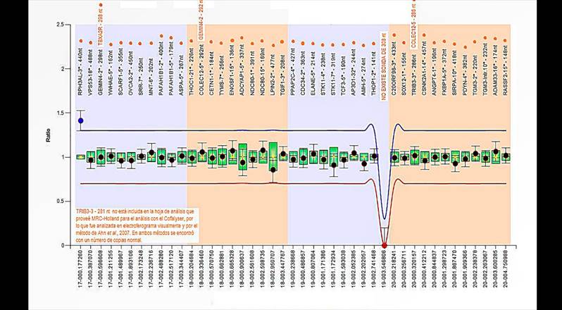 Nota. Este kit ofrece 11 sondas para la región 17p. Únicamente la sonda más distal presenta un valor alterado y responde al gen RPH3AL, lo cual confirma las copias extra de este. La hoja de análisis de Coffalyser para este kit tiene un error, por eso, los nombres correctos de los genes se visualizan en anaranjado sobre el nombre provisto por el programa (ver leyenda en letras naranja).
