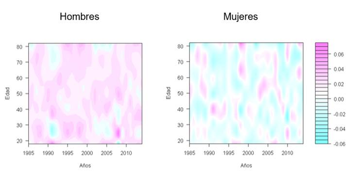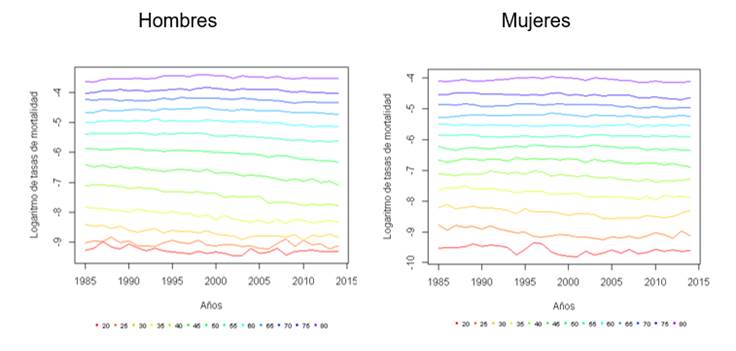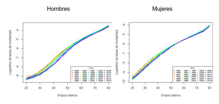 En la figura 2 se ilustran los logaritmos de las tasas de mortalidad para hombres y mujeres y sus curvas se ordenaron en el tiempo utilizando los colores del arcoíris. Los datos más antiguos (1985) se muestran en rojo, mientras los más recientes (2014) en índigo. La disminución en los niveles de mortalidad se da en ambos sexos a través del lapso estudiado, en otras palabras, son más bajos durante los años más recientes; no obstante, en el caso de los hombres, es evidente la baja para los grupos comprendidos entre los 30 y los 55 años, en cambio, en las mujeres esta disminución es más moderada y aparece entre los 20 y los 45 años. También es posible deducir que en las edades de 50 a 75, los índices femeninos parecen mantenerse aproximadamente constantes, pues equivalen a las curvas más estables de todo el periodo.
