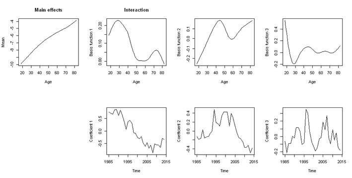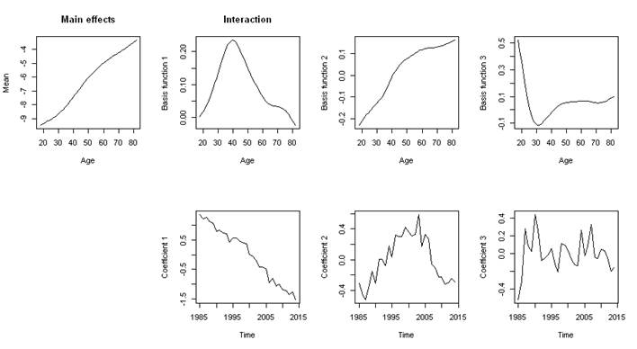 Acto seguido, se suavizaron los logaritmos de las tasas mediante regresión spline penalizada, esta permite ejecutar una restricción de monotonía: la función suavizada se supone monótona creciente para alguna edad x > c; en esta aplicación se utilizó c = 65, al igual que los autores del método. Con dicha restricción se logran mejores resultados, es decir, se reduce el ruido de las estimaciones de la curva para las edades altas, aspecto razonable, en tanto las probabilidades de morir aumentan conforme aumenta la edad de las personas. Una vez obtenidas las curvas (primera etapa) se construyeron funciones como una combinación lineal de ellas. Para eso, se examinaron los componentes principales y se descompusieron las curvas ajustadas (segunda etapa).