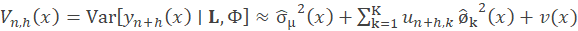 La variancia del pronóstico también se desprende de (7). Debido a la forma en que el modelo ha sido construido, cada componente es aproximadamente ortogonal a los otros, por eso, dicho cálculo se puede aproximar, de acuerdo con Hyndman y Ullah (2007), como la suma simple de las variancias de los componentes: