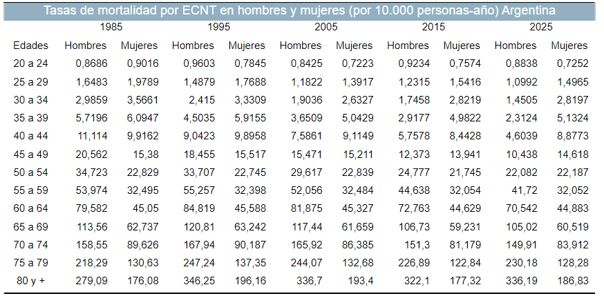 Recapitulando, la aplicación de este modelo probabilístico de pronóstico permitió analizar la situación argentina con respecto a las ECNT a través del estudio de las tasas de mortalidad por edad y sexo, así como describir su comportamiento en los grupos etarios menores de 70 años, cuyas defunciones son denominadas prematuras. Con ello, este trabajo busca sentar un precedente que resultaría útil para organismos de estadísticas oficiales y de salud a distintos niveles geográficos, departamentales o provinciales.