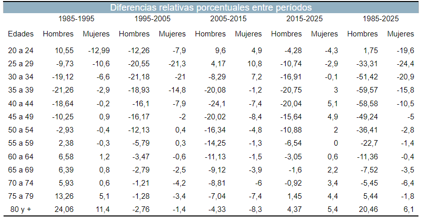 De ahí, se halló un descenso en los niveles de mortalidad masculina en la mayoría de los grupos etarios, a excepción de aquellos de mayor edad; en el caso de las mujeres, se dan descensos más moderados en todos los grupos etarios. La diferencia relativa en la mortalidad desde el inicio del periodo de estudio y el pronóstico para el año 2025 indica que, de continuar el comportamiento imperante en las tasas, se alcanzarían descensos de alrededor del 50 % para hombres de entre 30 y 50 años, y del 20 % para mujeres de entre 20 y 35 años.