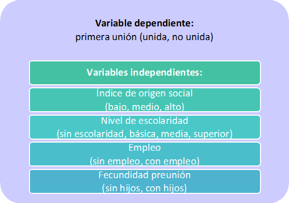 En estos modelos se dividió el ciclo de vida en episodios de un año. Estos segmentos anuales sirven como observaciones o casos, en donde la variable dependiente es dicotómica y diferencia entre haber experimentado el evento de la primera unión (categoría 1) o no haberlo hecho (categoría 0).