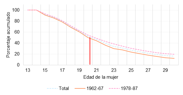 Destaca que las mujeres de la cohorte de nacimiento de 1962-1967 tuvieron su primera unión a la edad mediana de 20,7 años, en cambio, las nacidas de 1978 a 1987 la tuvieron casi a los 22,0 años. Al agregar más datos a los resultados anteriores, alrededor de un 13,0 % de las mujeres de la generación más antigua no habían tenido una primera unión a los 30,0 años, mientras que esta proporción aumentó seis puntos porcentuales (19,0 %) en la generación más joven.