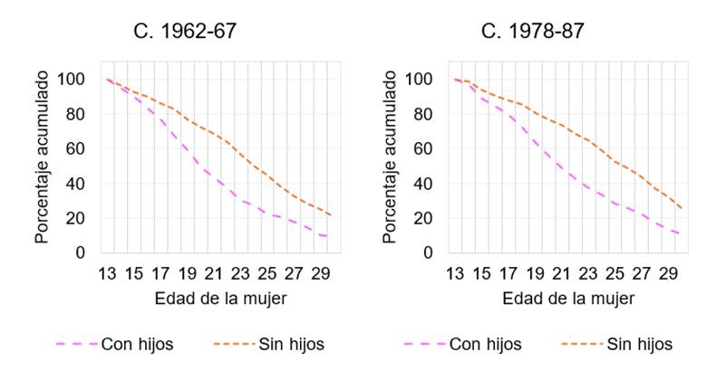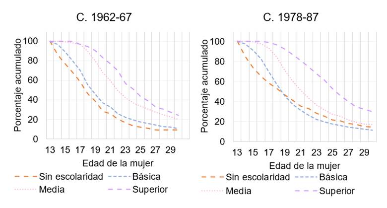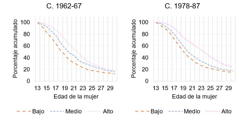 En este caso, se muestra la proporción de mujeres por cohorte de nacimiento que no estarán unidas a determinadas edades; organizadas según el nivel de escolaridad, la cifra resulta muy dispar; por ejemplo, alrededor del 12,0 % de las mujeres sin escolaridad no se ha unido a los 30,0 años en la cohorte más antigua, frente al 24,0 % de aquellas con escolaridad superior a esa misma edad. Para ambas cohortes de nacimiento, el subgrupo con nivel de escolaridad superior muestra retrasos sustanciales en todas las edades, en comparación con las mujeres de baja educación.