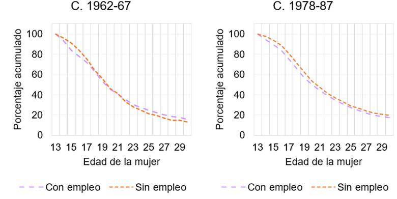Al contrario, las mujeres sin escolaridad, sin empleo y con hijos transitan a la primera unión a una edad mediana más joven que las antes mencionadas, aunque pertenezcan a los estratos altos (líneas continuas). Es decir, entre los 18,0 y 18,5 años en ambas cohortes.