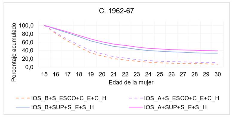 En el estrato más alto, las diferencias generacionales son de alrededor de 6,6 puntos porcentuales (24,2 % en las nacidas entre 1978 y 1987 y 17,5 % para las de 1962 a 1967), en tanto la diferencia es menor en el estrato más bajo. A los 30,0 años las más jóvenes de estrato más bajo se unen por primera vez aproximadamente 2,4 puntos porcentuales menos que las mujeres de mayor edad (14,8 % en las nacidas entre 1978 y 1987 y 12,4 % para las de 1962 a 1967) (figura 3).