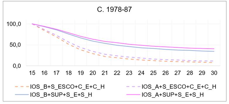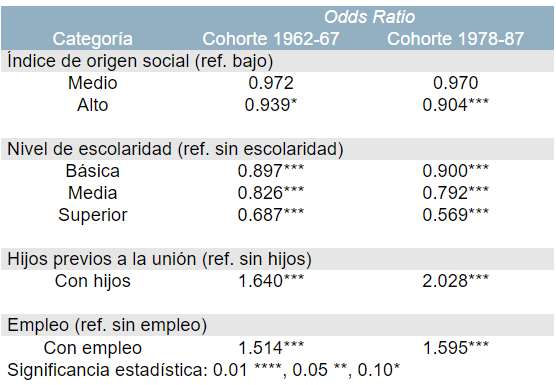Para concluir con esta investigación, se ajustaron los modelos logísticos en tiempo discreto para cada cohorte de nacimiento y los efectos de las variables independientes introducidas en el modelo se expresaron en forma de OR.
