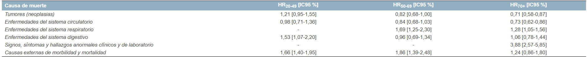 No se hallaron diferencias de mortalidad relacionada con enfermedades infecciosas y parasitarias (HREIP = 1,15 [0,79-1,66]), enfermedades del sistema digestivo (HRESD = 1,10 [0,91-1,33]), enfermedades del sistema genitourinario (HRESG = 0,88 [0,63-1,22]) o enfermedades del sistema osteomuscular y del tejido conjuntivo (HRESO = 0,54 [0,24-1,20]).