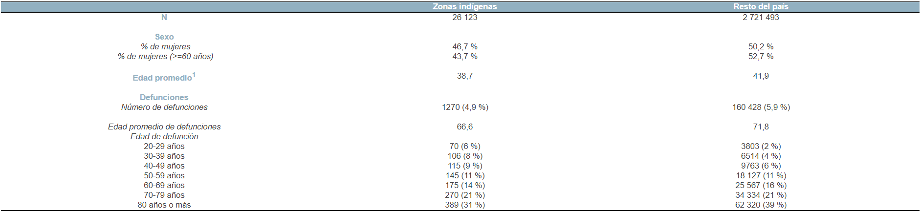 La edad promedio de quienes fallecieron durante el periodo estudiado también fue inferior en las zonas indígenas (66,6 años contra 71,8 años), de hecho, el 23 % de las personas que fallecieron en las zonas indígenas tenía menos de 50 años, frente al 13 % del general poblacional del país.