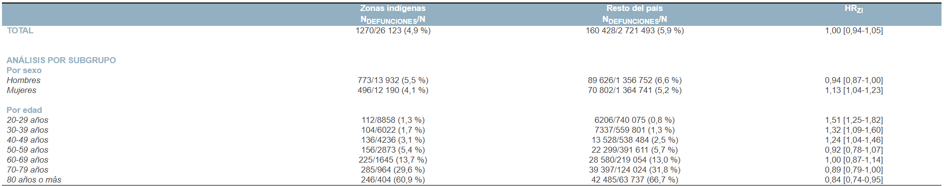 La tabla 3 incluye el cotejo de la mortalidad supeditado a si el distrito electoral de la persona se encontraba en una zona indígena o en otra área de los distritos con una zona indígena. No se evidenciaron diferencias ni a nivel general, ni en los hombres ni en las mujeres. Sin embargo, se observó, en las personas residentes de las zonas indígenas, una mayor mortalidad en las que tenían de 20 a 49 años al inicio del seguimiento, así como una menor en quienes contaban con más de 70 años en ese mismo momento.