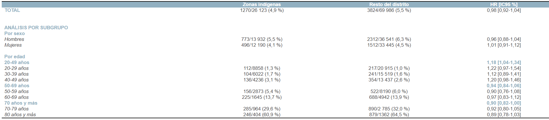 Por otra parte, de acuerdo con el análisis por edad la mortalidad fue superior en las poblaciones que viven en las zonas indígenas para las personas que tenían entre 20 y 49 años al inicio del seguimiento (HR20-29=1,51 [1,25-1,82], HR30-39=1,32 [1,09-1,60], HR40-49=1,24 [1,04-1,46]). Por el contrario, la mortalidad fue inferior en las poblaciones que viven en las zonas indígenas para las personas que tenían 70 años o más al inicio del seguimiento (HR70-79=0,89 [0,79-1,00], HR80+=0,84 [0,74-0,95]).