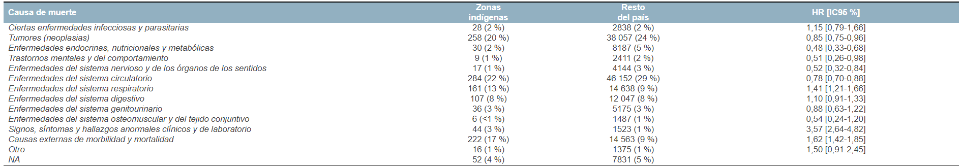 En contraposición, las causas externas de morbilidad y mortalidad representaron la tercera causa de muerte en las zonas indígenas con un 17 % de las defunciones, y la cuarta en el resto con únicamente el 9 %. Después del ajuste, la mortalidad por esta siguió siendo más alta en las zonas indígenas (HRCEMM = 1,62 [1,42-1,85]). De igual manera, la mortalidad por enfermedades del sistema respiratorio, que representa el 13 % de las defunciones en la zona indígena y el 9 % en el resto del país, fue mayor en la zona indígena (HRESR = 1,41 [1,21-1,66]).