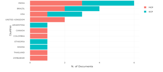 Artigos com autores com afiliação de países diferentes são chamados de publicação em vários países (MCP) e considerados como representando a colaboração internacional daquele país. Por outro lado, os artigos em que todos os autores têm a mesma afiliação de país são chamados de publicação de um único país (SCP) e são considerados como representando a colaboração intra-país (dentro) (Sweileh, 2017). A figura 2destaca que Argentina, Ethiopia e Ghana não apresentam cooperação, SCP no máximo do registrado. Reino Unido, Canada, Colombia e India apresentam alto percentual de colaboração internacional, enquadrado pela sigla MCP.