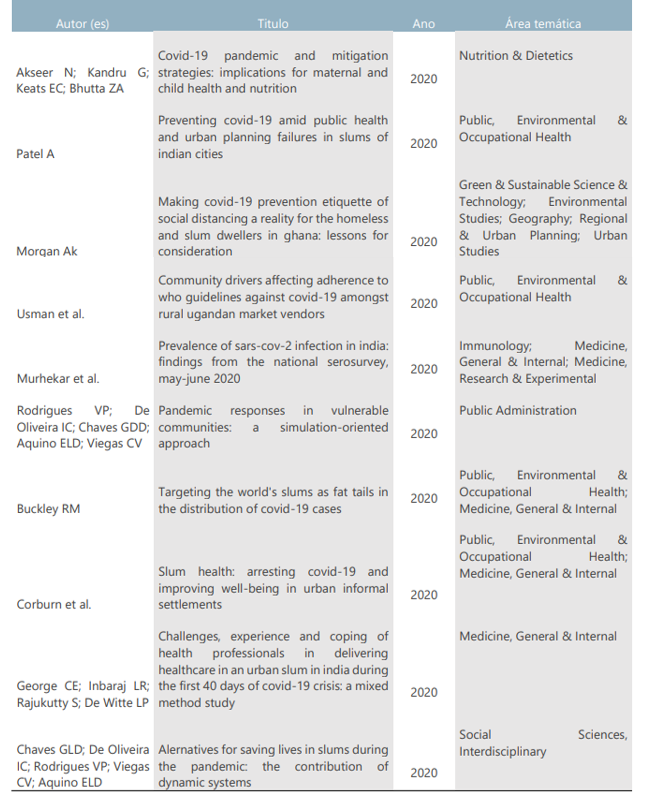 Dentre os 22 estudos científicos, Tabela 1, como resultado da busca realizada acerca das temáticas relacionadas as favelas em tempos de pandemia, foi possível identificar que as literaturas abrangiam as seguintes áreas: ciências multidisciplinares; saúde pública, ambiental e ocupacional; doenças infecciosas; construção e tecnologia de edifícios; engenharia ambiental; engenharia civil; medicina geral e interna; cuidados primários de saúde; ciência da computação, sistemas de informação; geografia física; sensoriamento remoto; geografia; nutrição e dietética; ciência e tecnologia verde e sustentável; estudos ambientais; planejamento regional e urbano; estudos urbanos; Imunologia; medicina, pesquisa e experimental; administração pública; ciências sociais interdisciplinares.