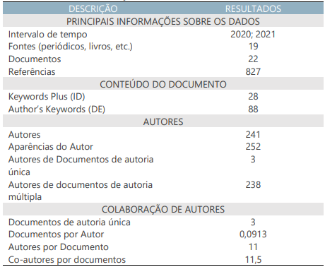 A amostra final é representada por literaturas diversificadas, abarcando os anos de 2020 e 2021. A Tabela 2 apresenta as principais informações sobre os dados, os tipos de documentos, os conteúdos, os autores e as colaborações de autores.