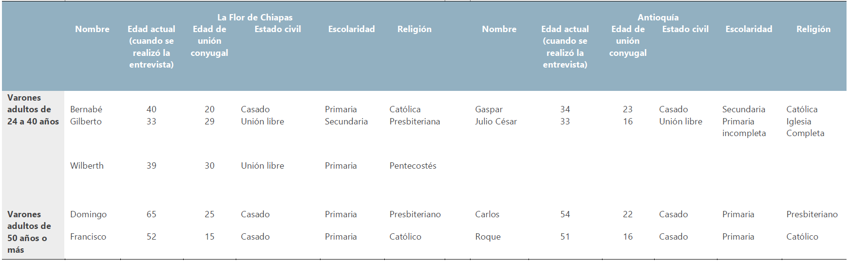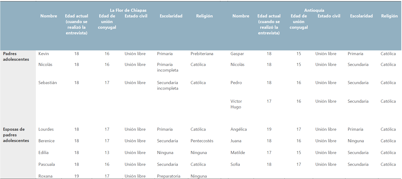 De tal modo, las entrevistas se desarrollaron en dos etapas, una durante abril de 2021 y otra en noviembre del mismo año. En la primera etapa se efectuaron 48 entrevistas, específicamente, 24 en La Flor de Chiapas y 24 en Antioquía; en cada localidad se entrevistó a 12 varones menores de 20 años que fueron padres antes de cumplir 18 años y a sus parejas, seis varones cuya edad (al momento de la entrevista) era de 24 a 40 años y seis varones de 50 años o más.