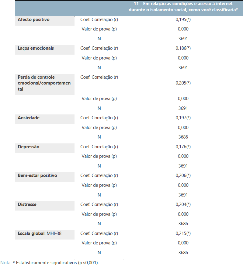 Verificaram-se relações positivas (r>0) e estatisticamente significativas (p<0,001) entre a Escala Global MHI-38, as dimensões Bem-estar positivo e Distresse e as dimensões primárias e as condições e o acesso à internet durante o isolamento social. Portanto, o estado de saúde mental global, as dimensões Bem estar positivo e Distresse e as dimensões primárias apresentaram tendência para aumentar conforme se tinha melhores condições e acesso à internet durante o isolamento social.